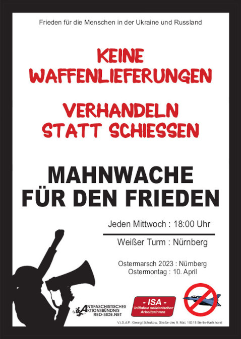 Liebe Friedensfreundinnen und Friedensfreunde, am 8. März ist Internationaler Frauenkampftag. Deshalb findet die Mahnwache für den Frieden diesmal ausnahmsweise um 17:15 Uhr statt. Direkt im Anschluss geht es weiter mit der Kundgebung „Gegen Krieg, Krise und Kapital, Frauen kämpfen international!“ Ab Mittwoch, 15.03. findet die Mahnwache wieder um 18:00 Uhr statt. Mahnwache für den Frieden Mittwoch, 8. März 2023, 17:15 Uhr Weißer Turm, Nürnberg Bitte kommt zahlreich und verbreitet die Info. Im Anhang gibt es den aktualisierten Flyer und das sharepic. Eure ISA